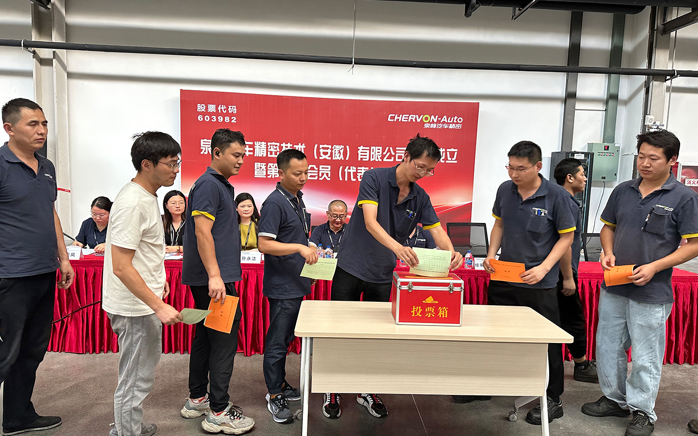 On the afternoon of August 11, 2023, the establishment of the trade union and the first member (representative) conference of Chervon Auto Precision Technology (Anhui) Co., Ltd. was successfully held in the machine workshop of the Maanshan plant, and 48 employee representatives and 17 non-voting representatives from various lines of the company attended the meeting.